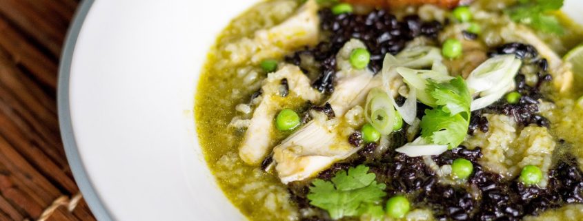 More substantial than a soup, more delicate than a stew, this classic Peruvian, comfort food (and hangover cure!) gets an elegant, modern upgrade. A hearty and robust cilantro-infused broth, with tender chicken pieces, green peas, striking black rice and crisp shards of chicken skin.