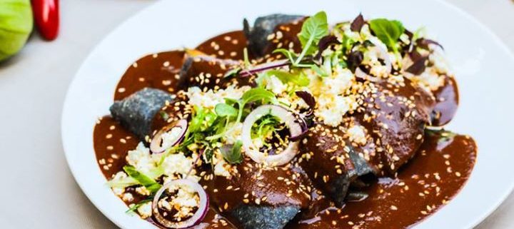 Chicken flautas (deep fried rolled tortillas) in a rich, traditional Oaxacan-style dark mole sauce made from scratch, served with with organic greens, pickled onions and toasted white sesame seeds.