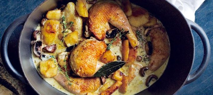 The Auge Valley is lush green region in Normandie, and this luxurious dish celebrates the bounty of the landscape. Tender chicken breasts are sauced with a combination of apple, cider, mushrooms and fresh cream. Served with seasonal vegetables, and new potatoes roasted in butter and dusted with Fleur du Sel, another specialty of the sea coast.