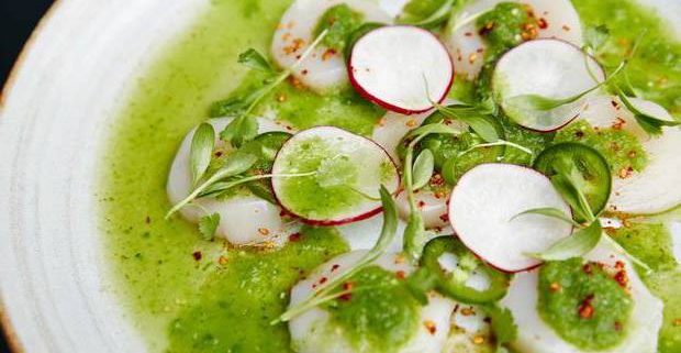 Carpaccio of fresh scallops lightly cured in a spicy, tangy Mexican “chile water” of cucumber, cilantro, lime and green chiles, with creamy avocado, sweet mango and crispy totopos.