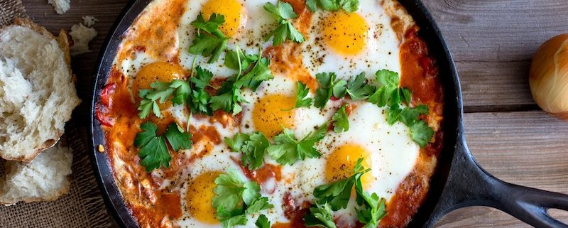 Jazmaz — a stellar dish of eggs cooked in a delicious tomato sauce and garnished with awarma (optional) — a unique preparation of small cubes of salted halal beef confit — the Syrian answer to bacon bits!