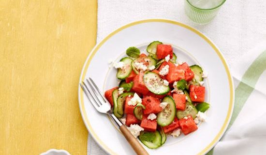 Juicy watermelon and cool cucumbers are tossed with tangy feta cheese to make this simple and colourful summer salad. A few leaves of fresh mint, olive oil and lime juice help tie all the flavours together.