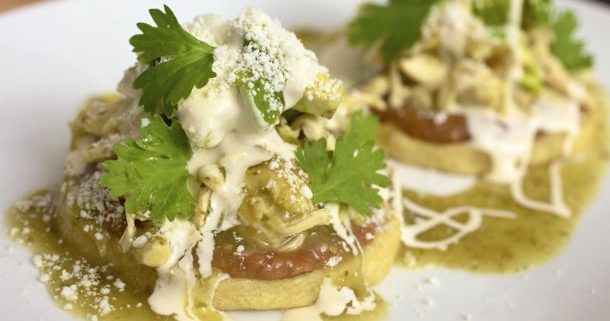 Sopes are a traditional Mexican dish originating in the central and southern parts of Mexico. Like an extra thick tortilla, this circle of fried corn masa has raised, pinched sides to help it hold a wide variety of toppings like black beans, crumbled cheese, lettuce, onions, salsa verde and sour cream.